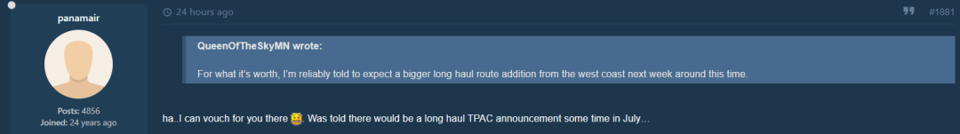 在大伙儿分析了一众可行性之后,一位论坛用户表示本月将会有一条跨太平洋的长途航线,另外一位表示这条航线将从美国西海岸出发……