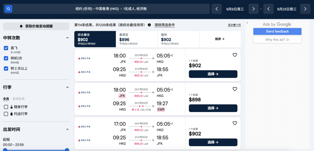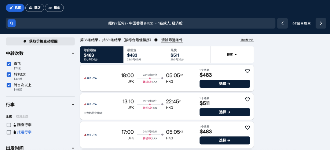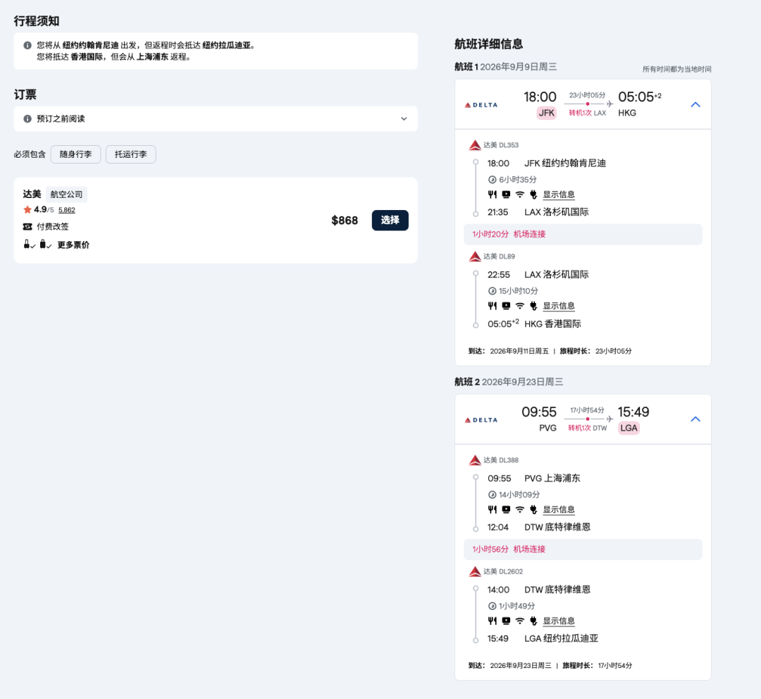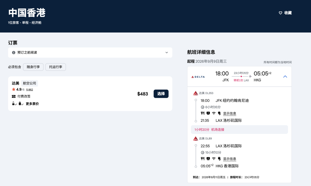 纽约-洛杉矶LAX-香港HKG