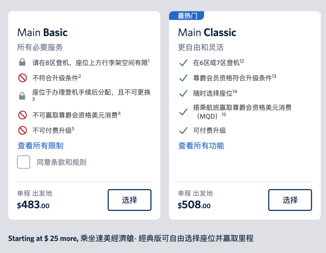 基础经济舱:允许免费携带1件登机行李+背包等个人物品,托运行李第一件免费,每件不超过23公斤(50磅)
