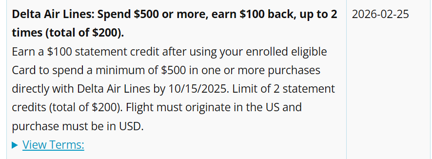 目前有的AMEX 达美航空的Offer,满500减100美金 (原来10月15日过期,看来现在延期了),当然不同人有不同的offer,也有400-80的~ 大家可以相互借一下。