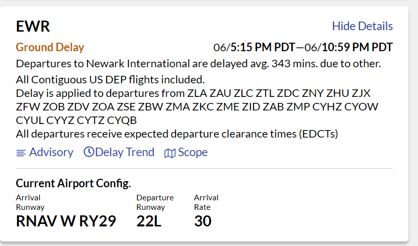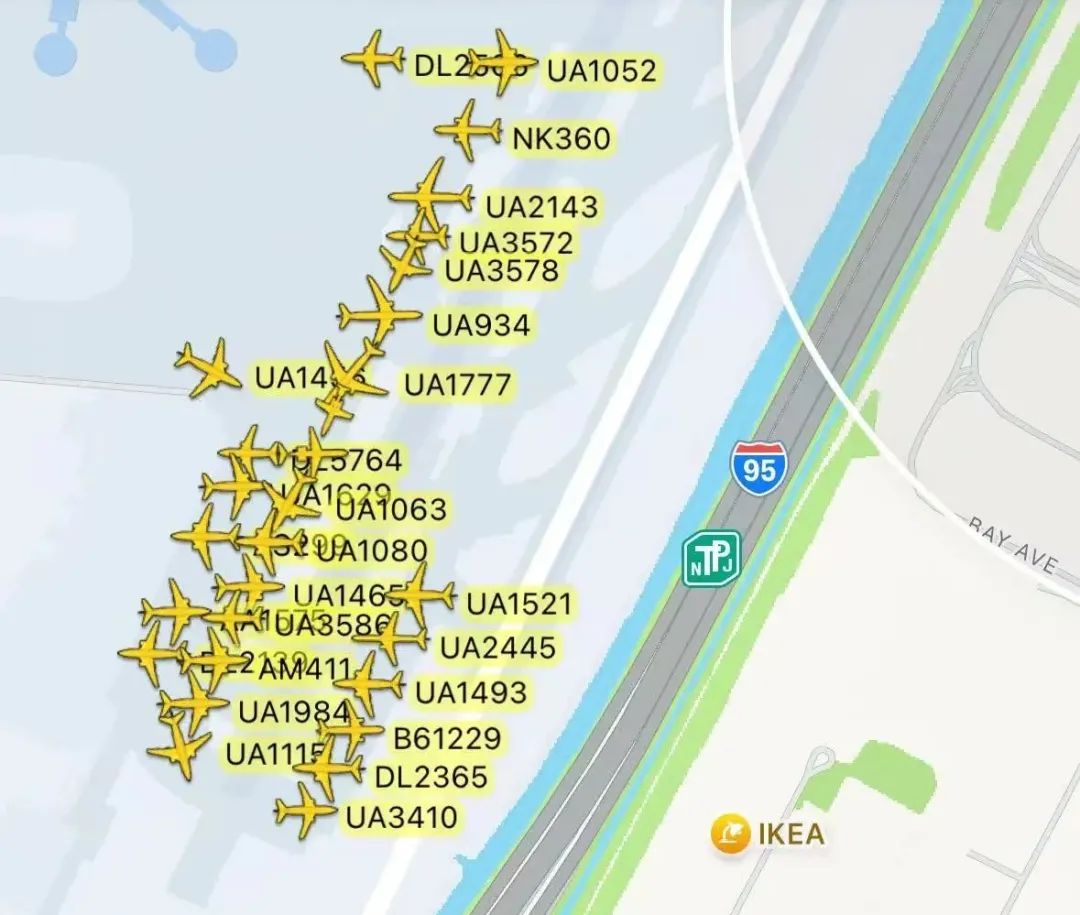 而美国联邦空管局一度将每小时进港航班的数量继续压缩至20班,为原来的一半。这些因素造成了,航班飞不进来;飞进来了又堵在地面;好不容易推出又要等很久才能起飞;长途航班等得太久,机组超时就只能回登机口取消航班,找新机组……太刺激了.