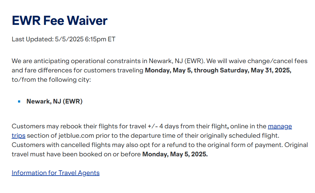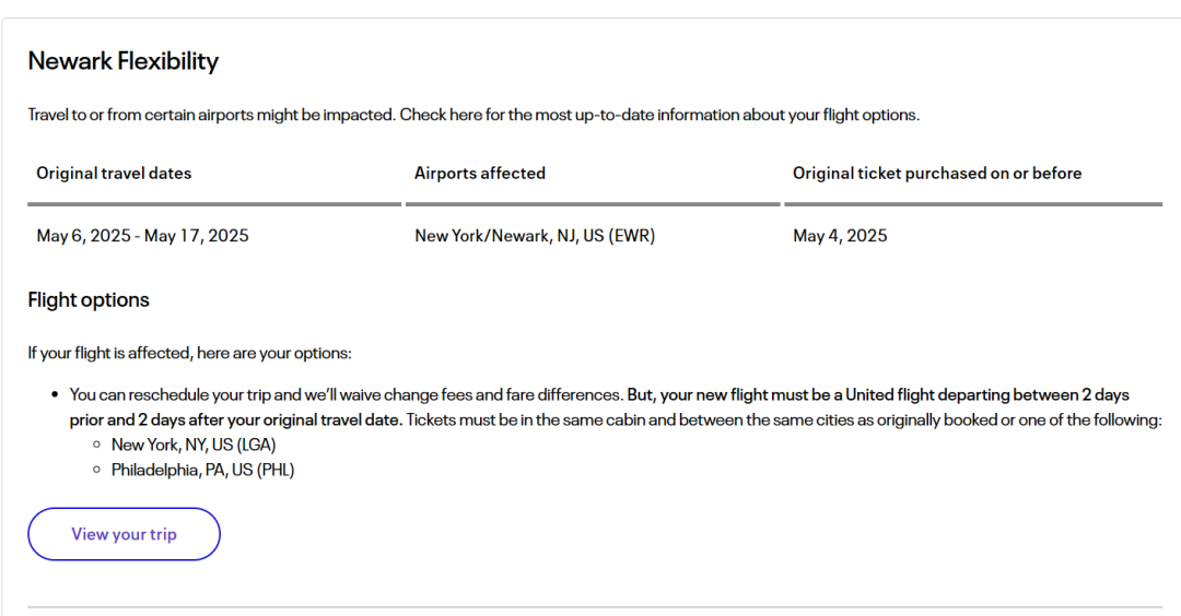 允许5月4日之前购票且计划在5月6日-17日经由纽瓦克EWR机场旅行的乘客,可在原出发日期正负2天内,免航司手续费和差价改票。同时,也可将行程中的纽瓦克机场改为纽约拉瓜迪亚LGA或费城PHL机场 https://www.united.com/en/us/fly/travel/trip-planning/travel-alerts.html