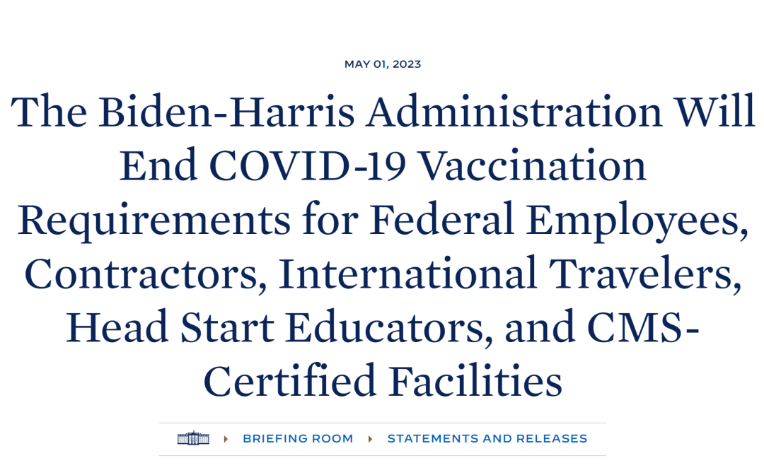 https://www.whitehouse.gov/briefing-room/statements-releases/2023/05/01/the-biden-administration-will-end-covid-19-vaccination-requirements-for-federal-employees-contractors-international-travelers-head-start-educators-and-cms-certified-facilities/