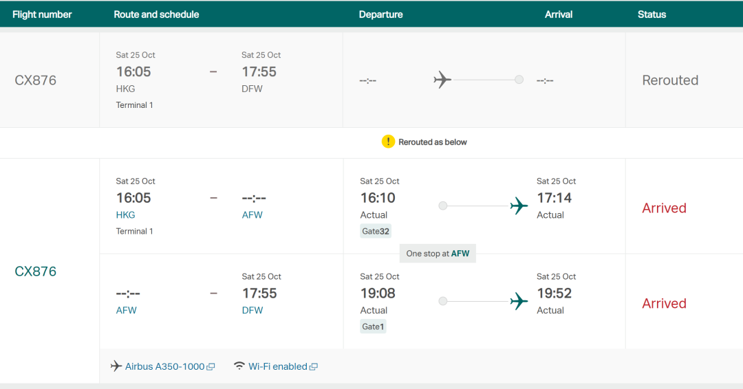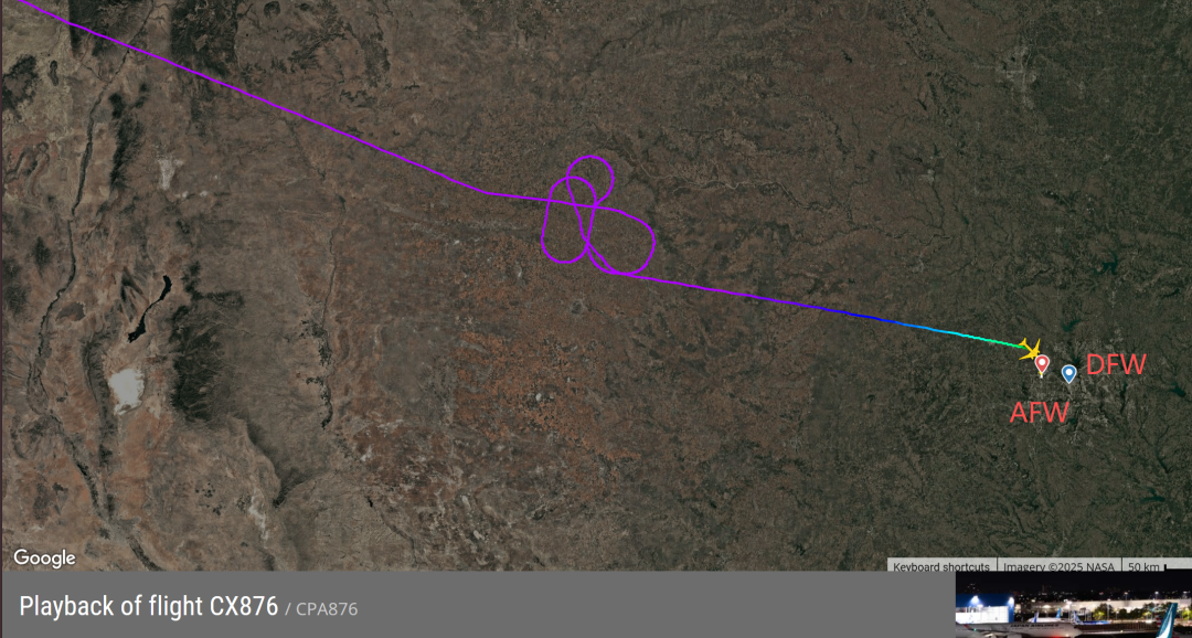 不过,10月25日当天,由于达拉斯机场遭遇雷暴天气,CX876在盘旋许久之后,决定备降距离DFW机场18英里外,主要负责货运的AFW机场。