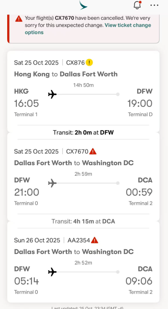 我爸妈的机票是10月25日香港-达拉斯-华盛顿DC,其中香港-达拉斯段是国泰的CX876,达拉斯-华盛顿DC是美国航空承运但国泰代码的CX7670(AA2077)航班。计划在达拉斯的转机时间有3个小时,还算是充足。从大湾区飞DC的选择并不多,这个航班正好可以让爸妈一停到家。