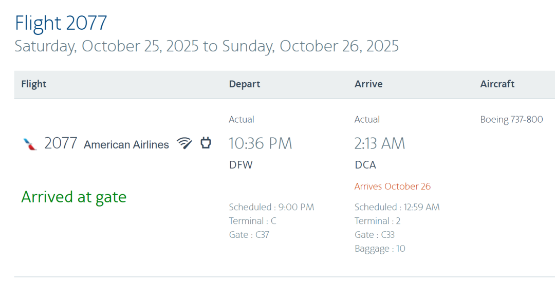 在等爸妈清关的同时,我发现其实AA2077航班并没有取消,也受天气影响晚点了2个小时。于是,在爸妈过关之后,我立刻让他们跑到AA2077的柜台,最后踩线顺利登机。虽然抵达DCA的时间已是凌晨2点,但总好过在人生地不熟的机场过夜。
