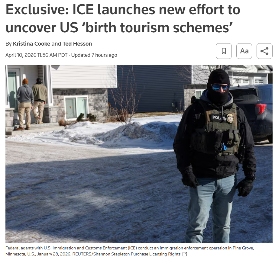 大家都知道,多数美国旅游签证的有效期是10年,为了防止先签证后怀孕,再来赴美生子的做法。这时候就轮到国土安全部旗下的美国移民及海关执法局ICE出马了——路透社的记者看到了ICE于4月9日发布的内部信件。ICE已命令全国各地的调查人员重点关注一项“生育旅游计划”,重点打击为赴美旅游生子这个产业。