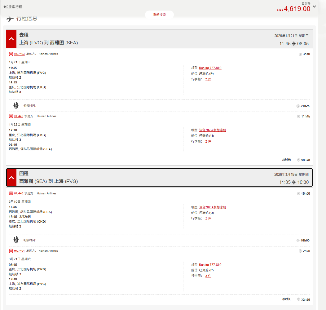 一般来说,因为北京-西雅图有海航自己的直飞,所以,会被排除在促销以外,但这回也包括了~ 不知道万一北京-重庆有异常,能否直接改成北京-西雅图直飞呢?