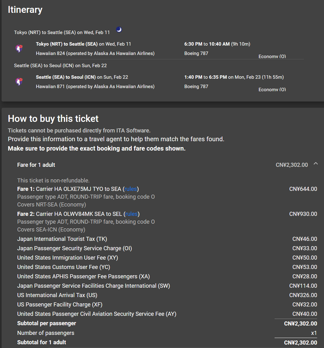 这张票太nb了,以至于Alaska和夏威夷航空的官网是搜不出来的,但第三方OTA是可以出票的……