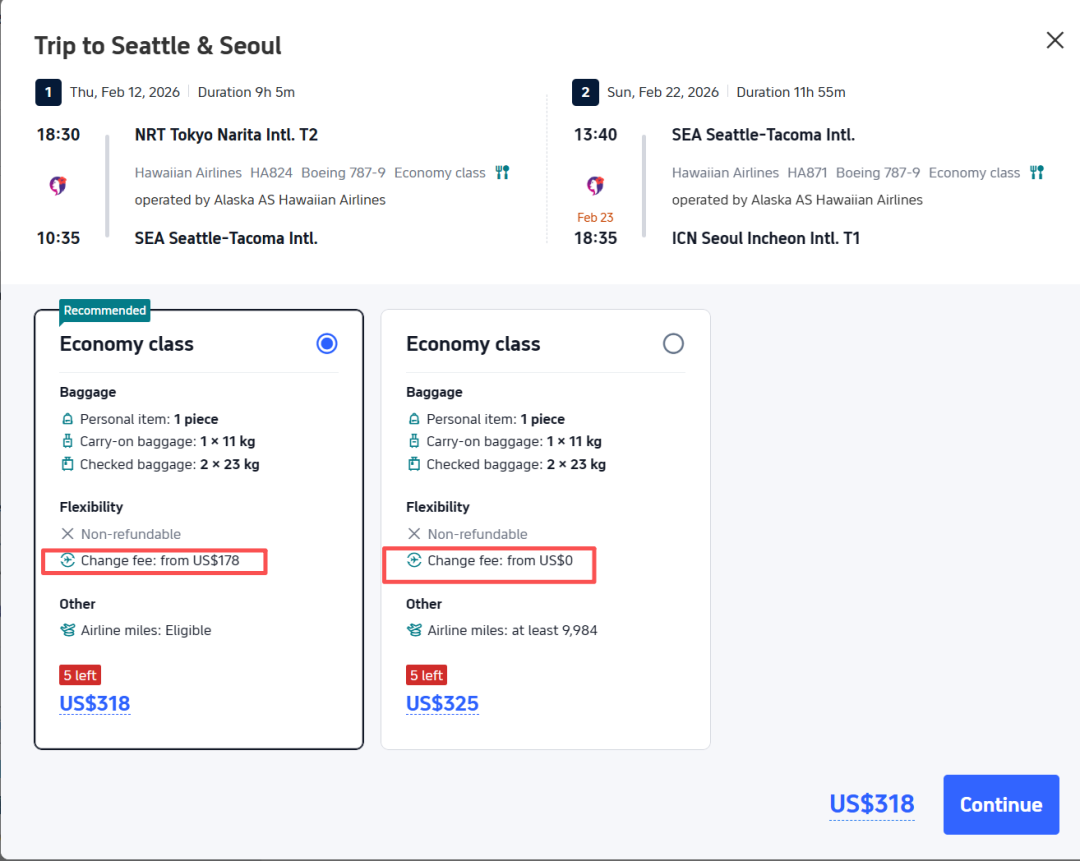 trip.com的价格是318 -325 美金 –> 要选325美金的,可免费改票