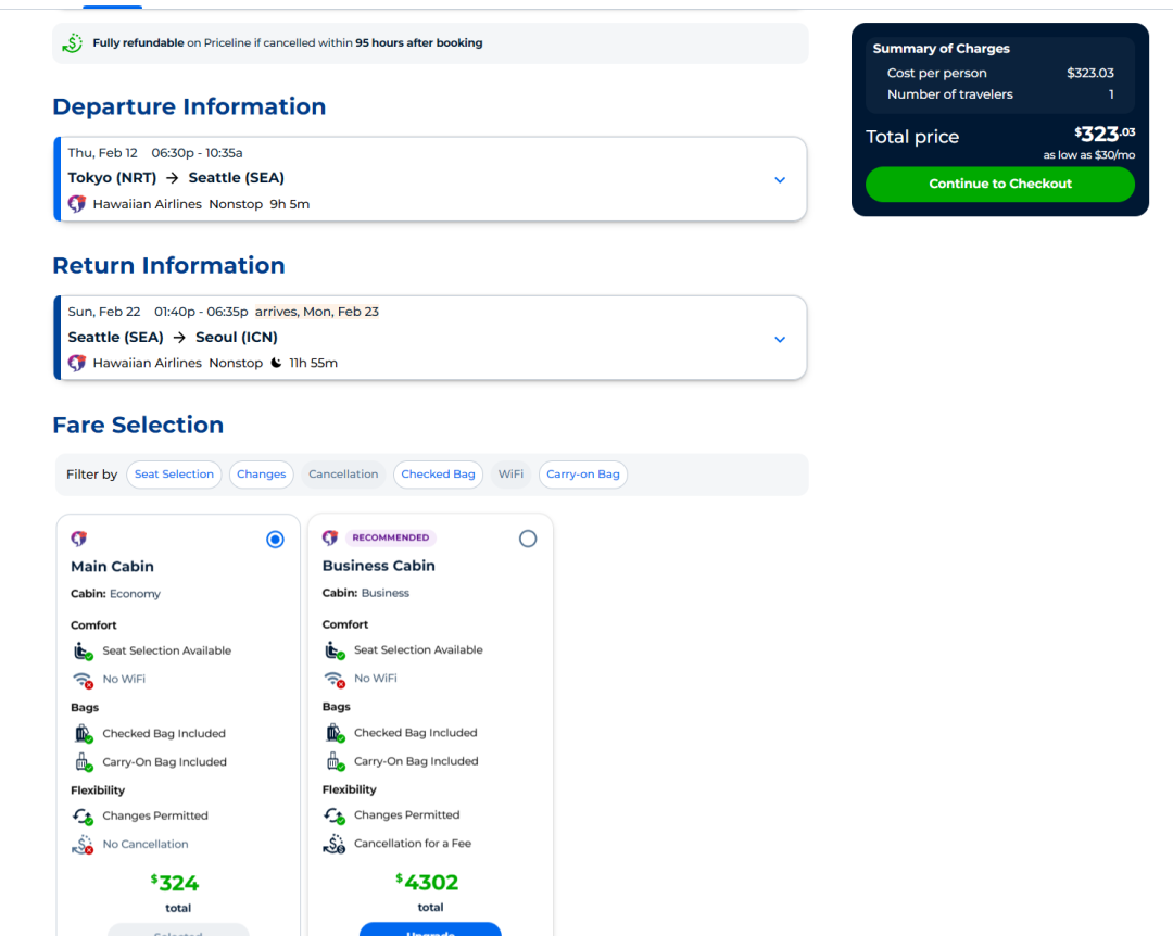 另外,老牌的OTA Priceline 323美金,直接免费改票~ 且有至少24小时购票保护。
