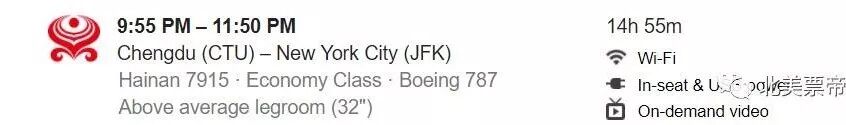 | HU 7915 | 成都CTU | 9:55 PM | 纽约JFK | 11:50 PM | 周二、六 |
