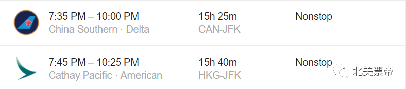 虽说票帝说过夜间出发定义为晚8点之后,但是考虑到距离长达8000英里,要想赶在夜深了之前到达,南航和国泰各有一班稍微早些的航班直飞纽约: