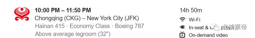 | HU 415 | 重庆CKG | 10:00 PM | 纽约JFK | 11:50 PM | 周一、五 |