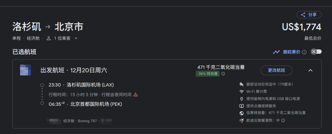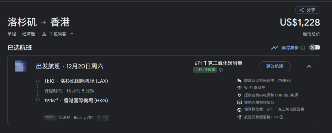 那我就贴一个200 公里外洛杉矶直飞香港同日期的票(1228美金,),看看什么叫做贵!