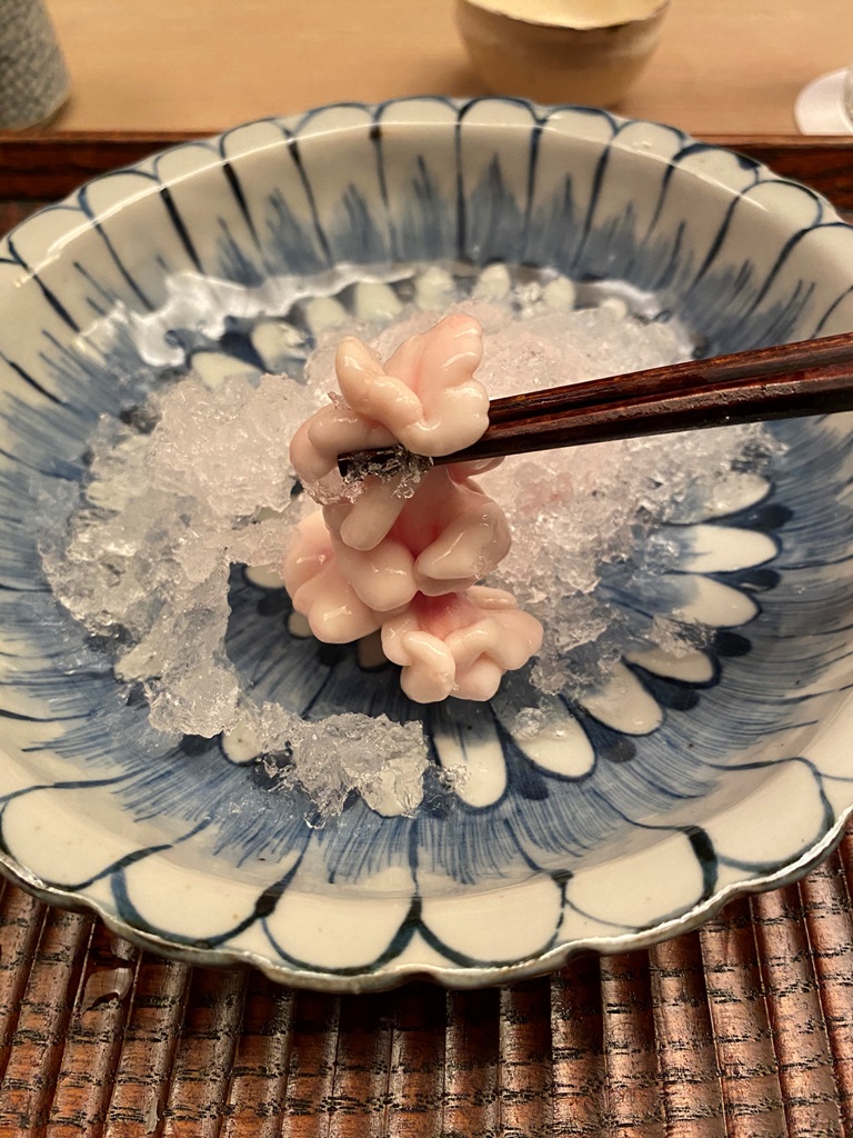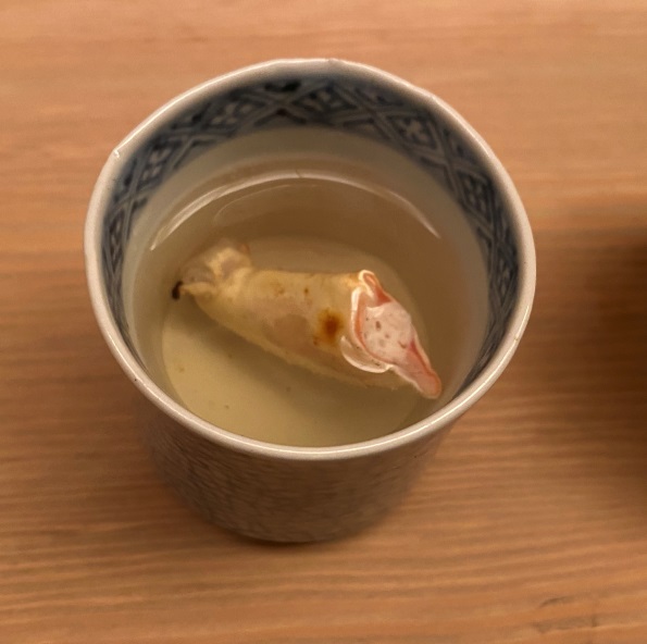 到点主厨石川会出来迎接你,但因为是外国人第一次,所以给了包间,由英文好些的女将和学徒来服务—但实际也没好到哪里去,多问几句也就说不明白了,虽然对于一般通过日本人还是很好的。如果你懂日文,那就是吧台待遇了。因为是冬天,所以菜单的主打是松叶蟹,白萝卜和牛蒡。酒杯在帝国楼下看到过,要100多刀一个呢。。。毕竟是东京人比较好(这句话针对京都)外国人也多,店主会来英文聊两句。另外店主特别喜欢自拍,去看看他家的report就是石川主厨跟各种食客自拍的照片。
