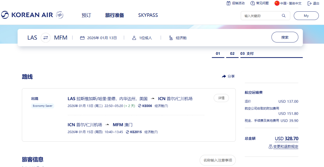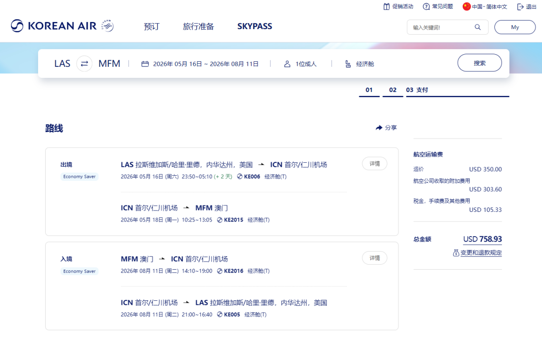 美国赌城拉斯维加斯有一条飞首尔的独门亚洲航线,由大韩航空运营,与隔壁的旧金山、洛杉矶相比,这条航线的运价普遍较高。而大家一般找特价机票的时候,都会想着香港,很少想到旁边的澳门。而这次,我们惊喜地发现,大韩航空两座赌城之间放出了很好的价格,甚至比香港、上海还要低。
