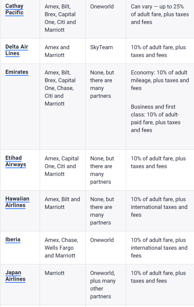 The Points Guy 总结过常用航司的国际婴儿票计算方法,可供大家参考。Highlight是加拿大航空AEROPLAN、Virgin Atlantic、ANA、韩亚、大韩航空、大韩航空、西南航空等比较厚道。 部分航司的婴儿票的10%会使用全价成人票计算……(国际商务舱的全价票即使打1折,也不是个小数目)
