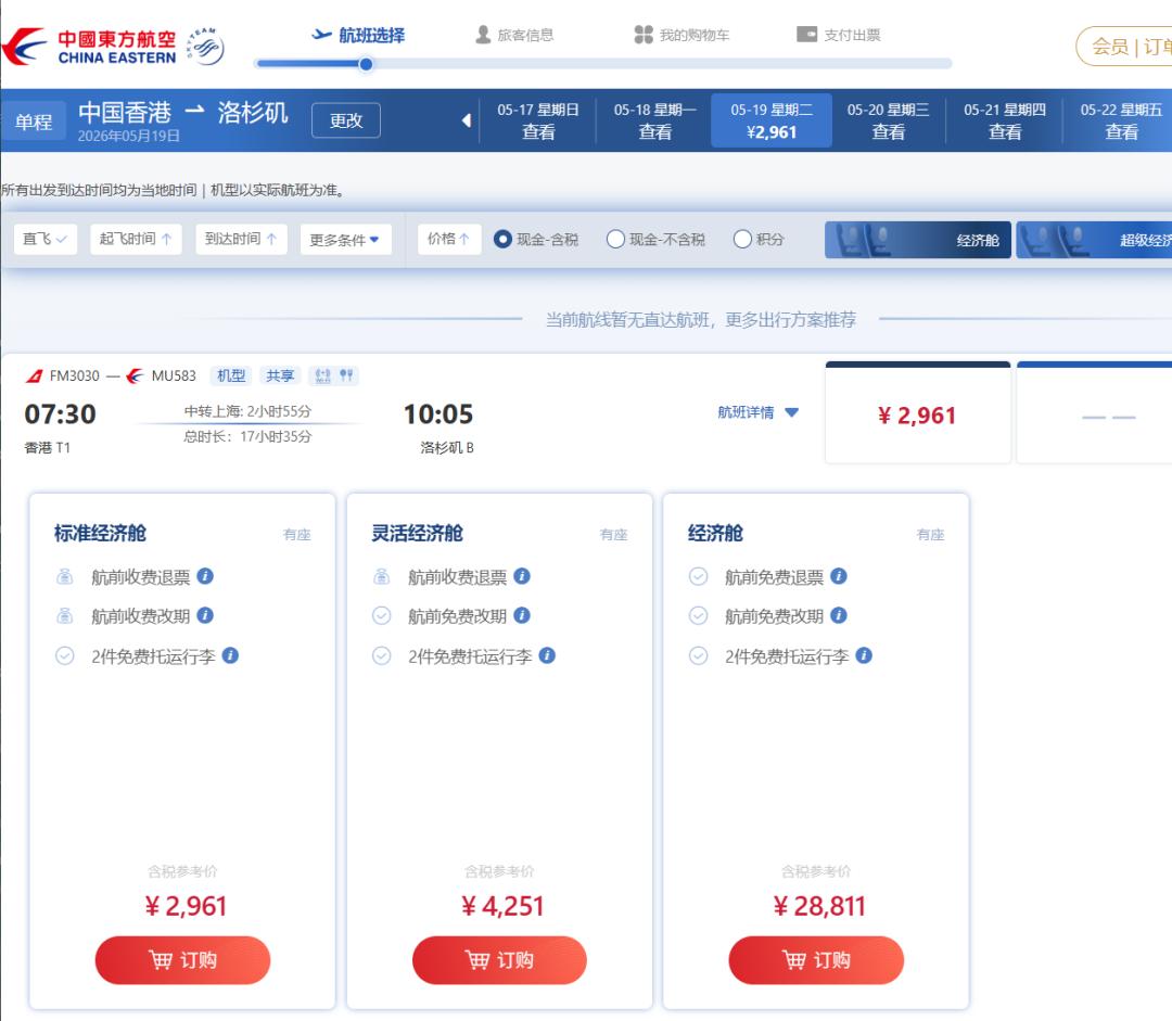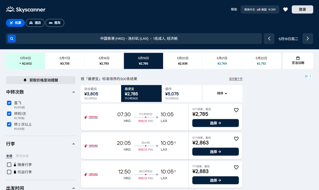 而在其他平台上,同样香港-上海-洛杉矶最低价2785元(退完税2610元)