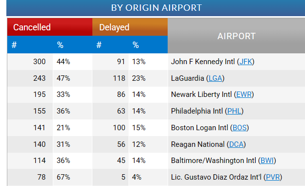 风雪天并不只影响纽约,同时还包括了美国东北部地区。截至发稿时,2月22日当天共有3748架次的航班,集中在纽约、费城、波士顿、华盛顿等人口稠密地区。