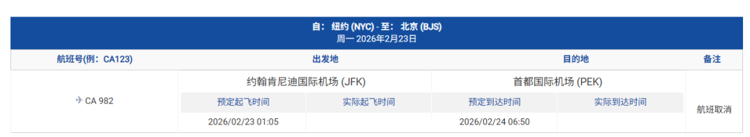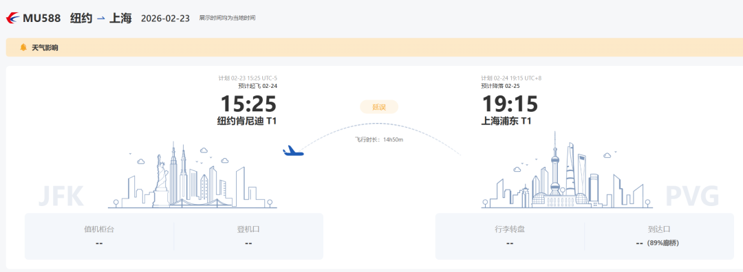 原2月23日起飞的东航MU588 纽约-上海航班,延误24小时至2月24日起飞(之后请继续留意航班状态)