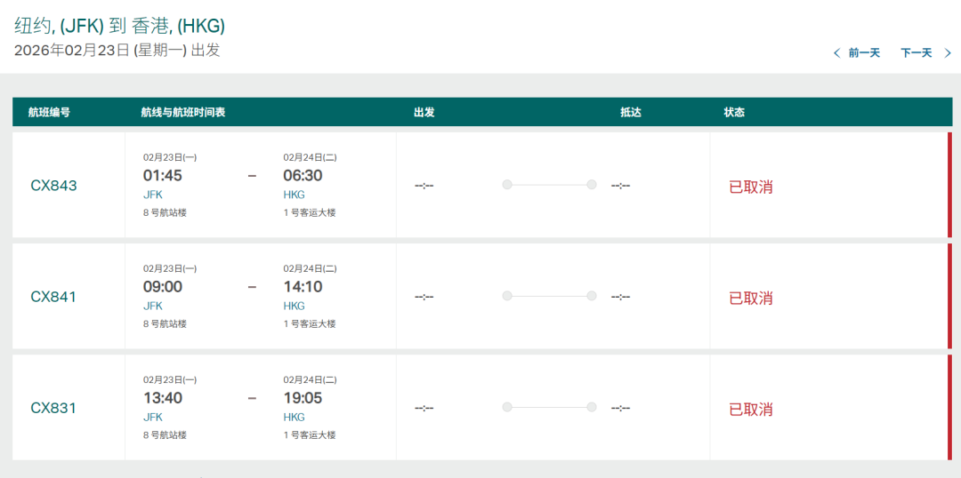 2月23日已经宣布取消了4832架次。取消的班次包括了长途航班,比如国航的CA981/CA982 北京-纽约,国泰从波士顿、纽约飞往香港的航班等。