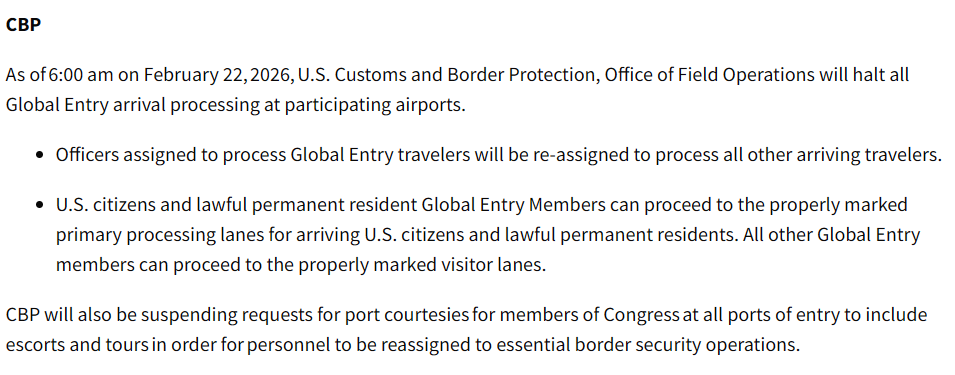 因为预算未达成一致,美国国土安全部宣布自美东2026年2月22日早上6时暂停快速通关Global Entry (GE)项目。