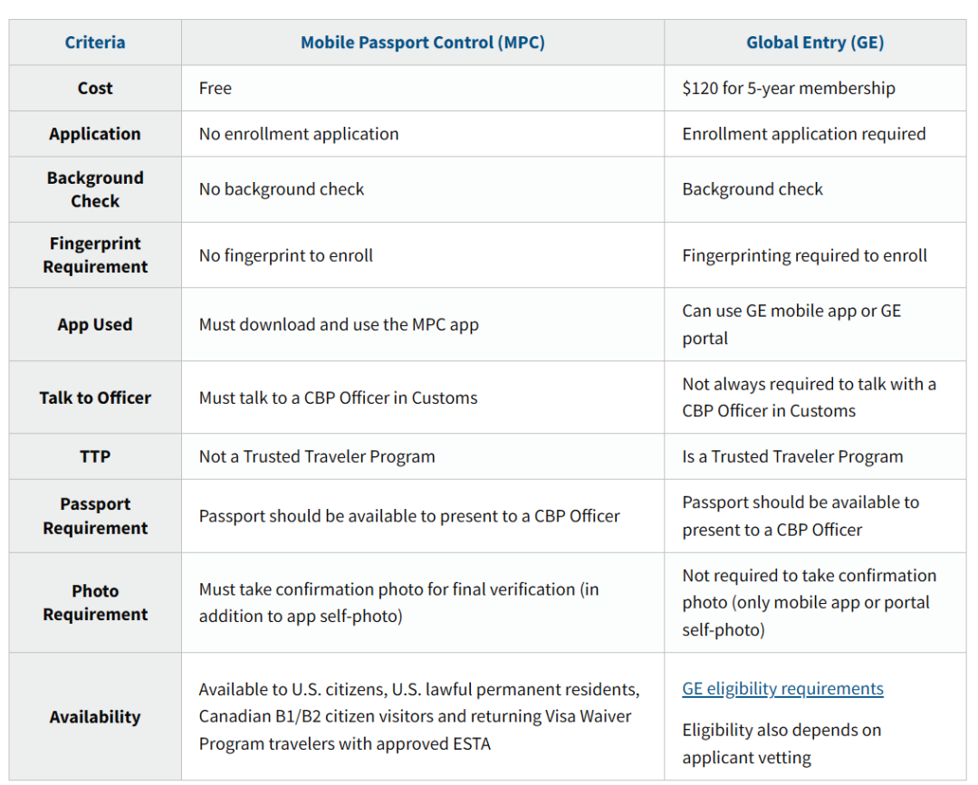 如果拥有美国护照、美国绿卡、加拿大护照及ESTA免签地护照的读者,可考虑使用免费的MPC(Mobile Passport Control) 服务,可适当加速入境流程。下图是MPC和GE的区别。