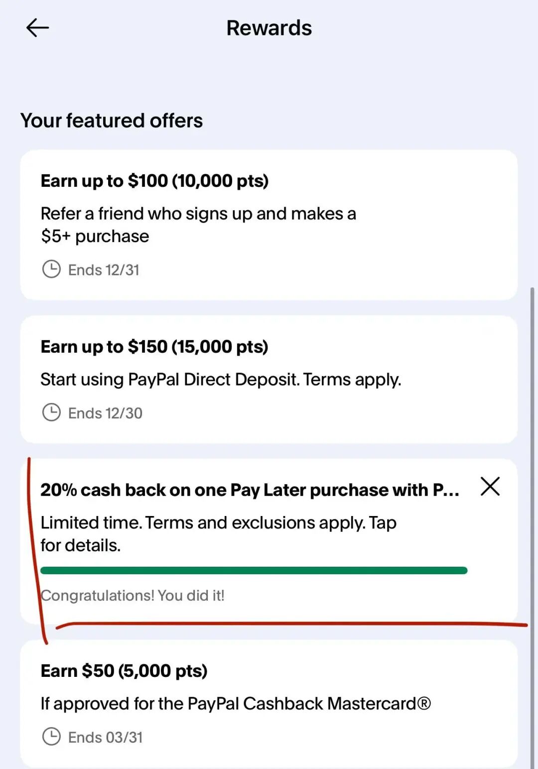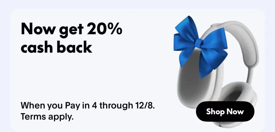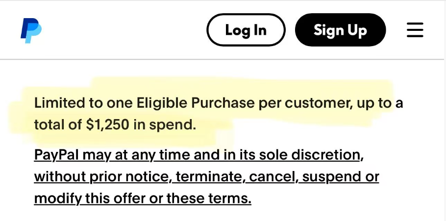 11月26日之前,单笔消费不超过1250美金,则笔笔成功的Pay in 4都可以享受20%的返款。11月26日之后,条款收紧至总共一笔,单笔消费不超过1250美金(最高返款价值250美金的PayPal积分)。