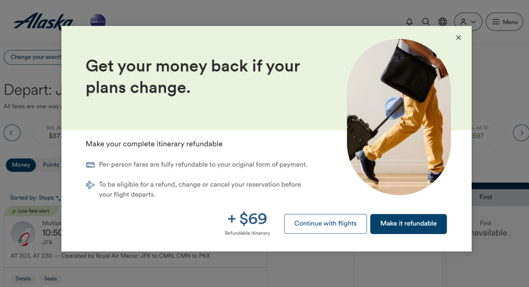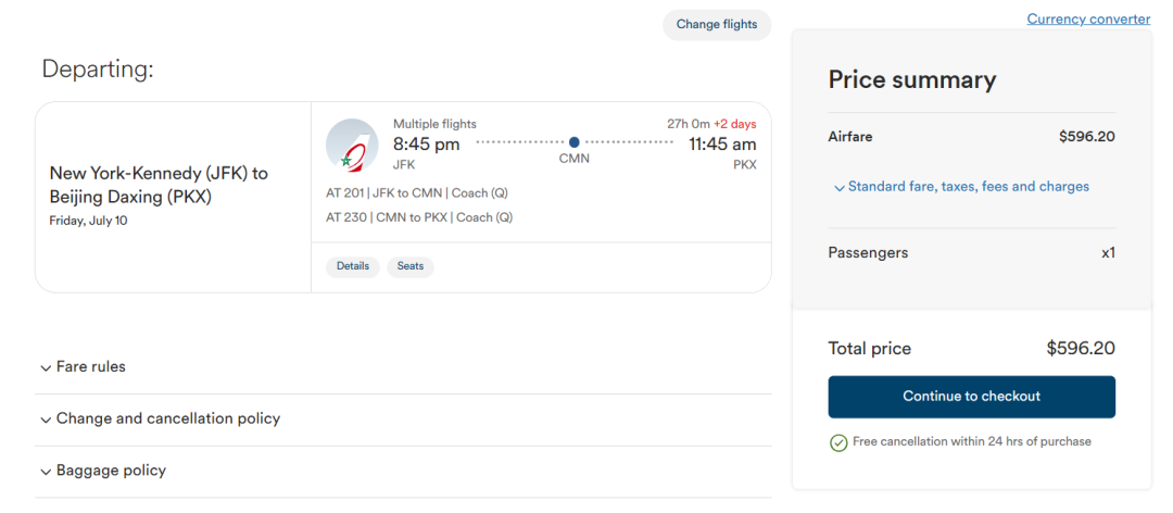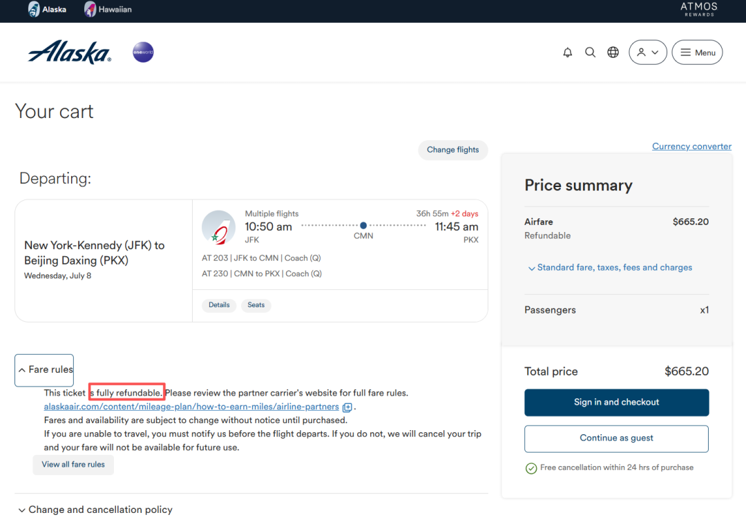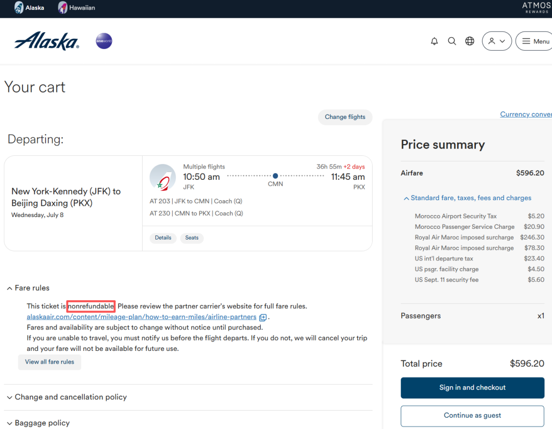 其实665.20美金的票还是需要250欧元等值美金的退票费,虽然比摩洛哥航空的官网厚道,但不要被误导了真以为是全额免费退票的……我帮大家试到了出票之前,原本的fully refund消失了,最终还是说以“票规”为准。