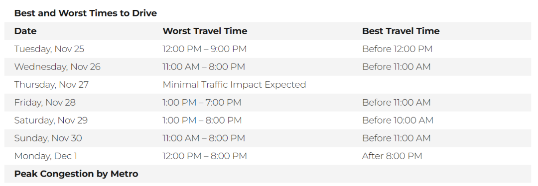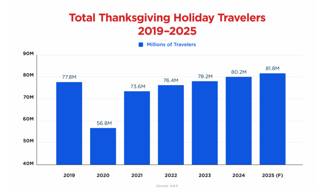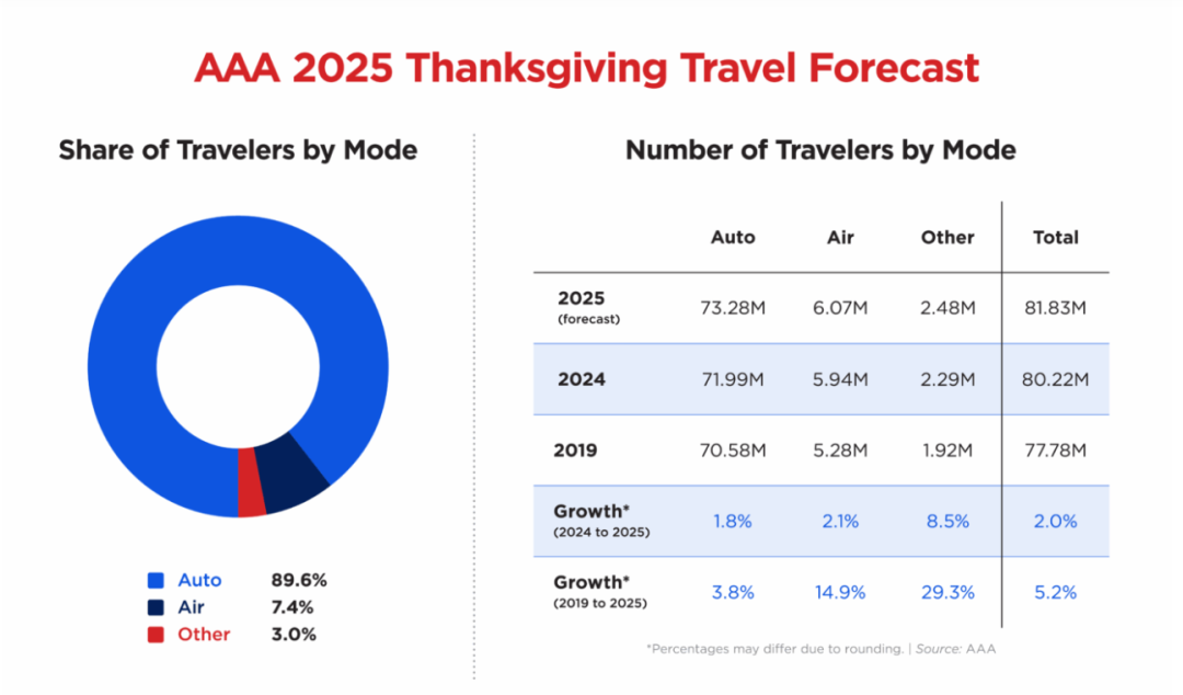 美国汽车协会AAA预测,11月25日-12月1日间,有接近8200万人会在美国境内出行,比2024年增加160万,再次刷新2000年以来出行人数的历史记录。这其中7300+万人会选择公路出行,600+万选择搭乘飞机。机场、高速公路会异常的繁忙。