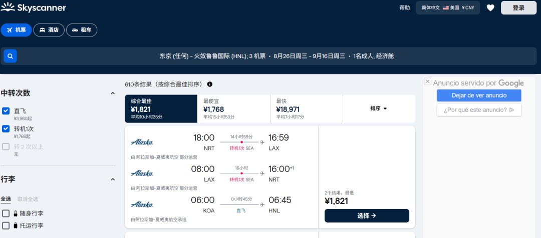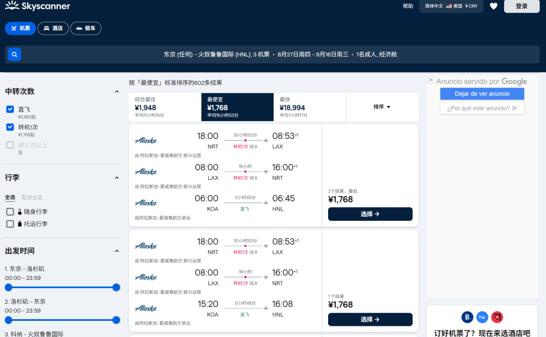 推送洛杉矶只是因为价格是最低的,类似AS东京出发的路线都有,目的地也包括了西雅图(直飞)、芝加哥、纽约等。