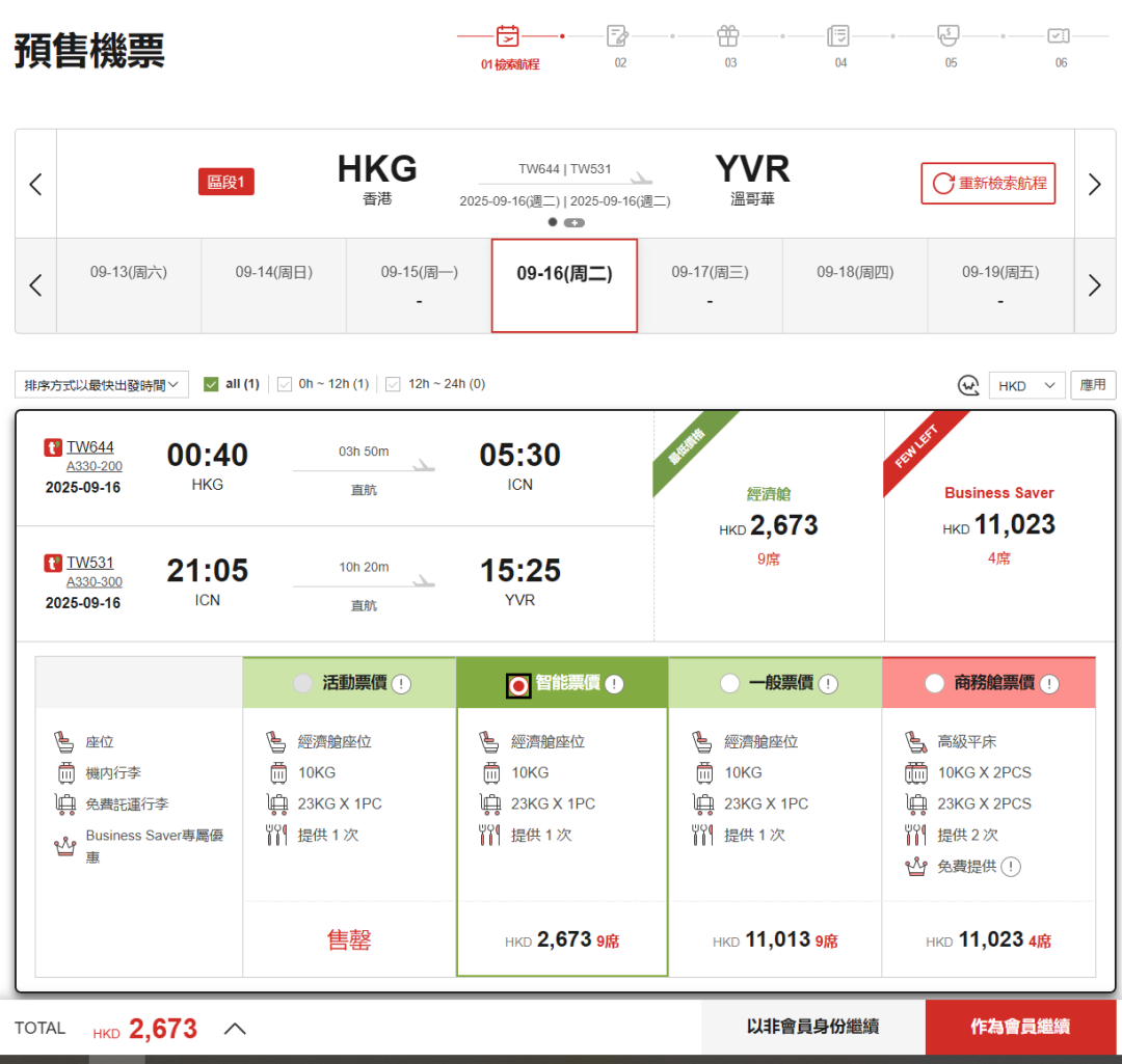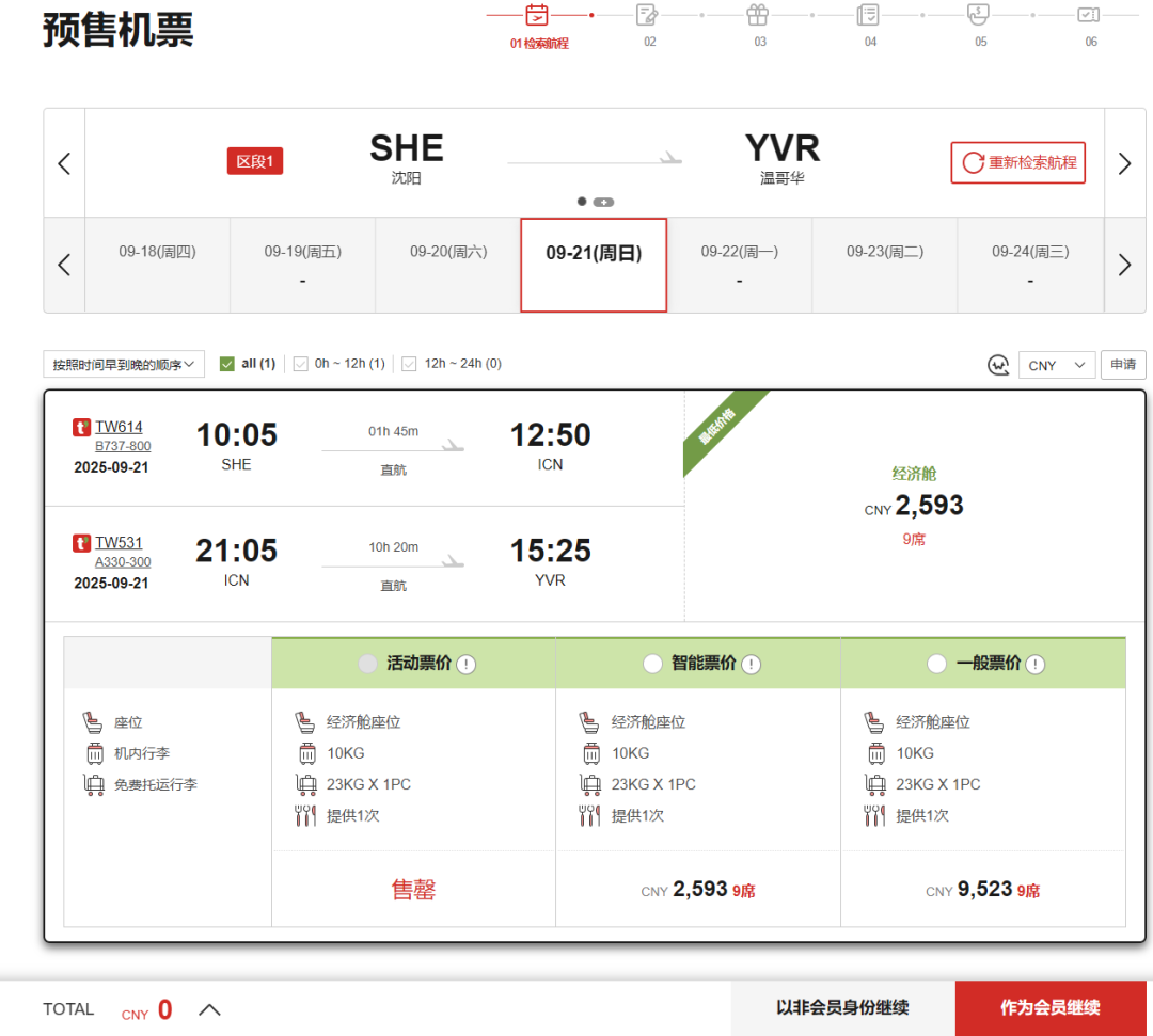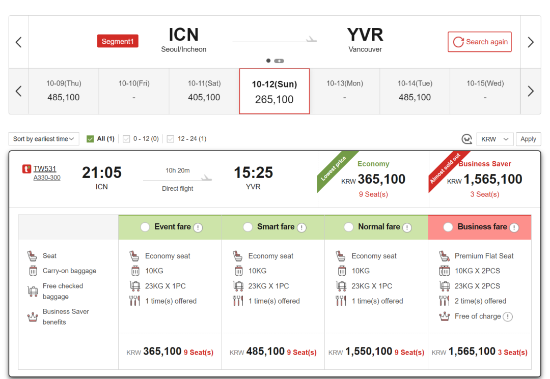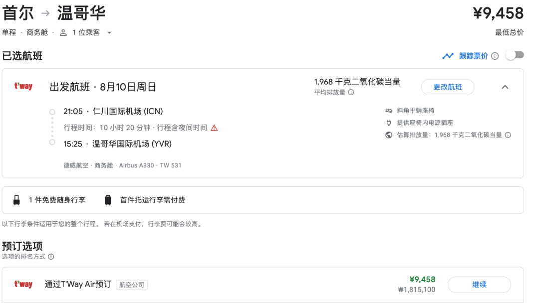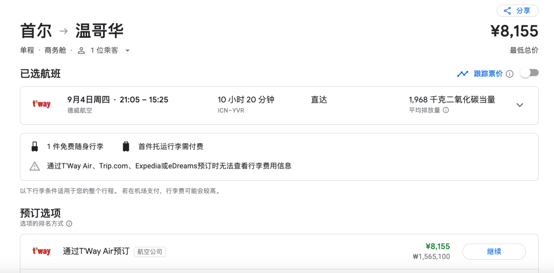 随着大韩航空和韩亚航空的合并案的批准,为了满足反垄断要求,韩国必须扶持其他航空公司,于是,德威航空TWay就拿到了首尔-温哥华的航权。我们发现,他们放出了双向大量低价,无论是2000元不到的经济舱,还是8000元的公务舱,都是跨太平洋地板价。虽然是廉航,但是包含行李和餐食,中国出发特别容易衔接~ 话不多说,上~