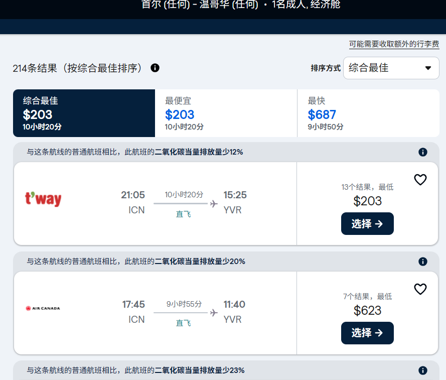 首尔仁川ICN-温哥华YVR双向