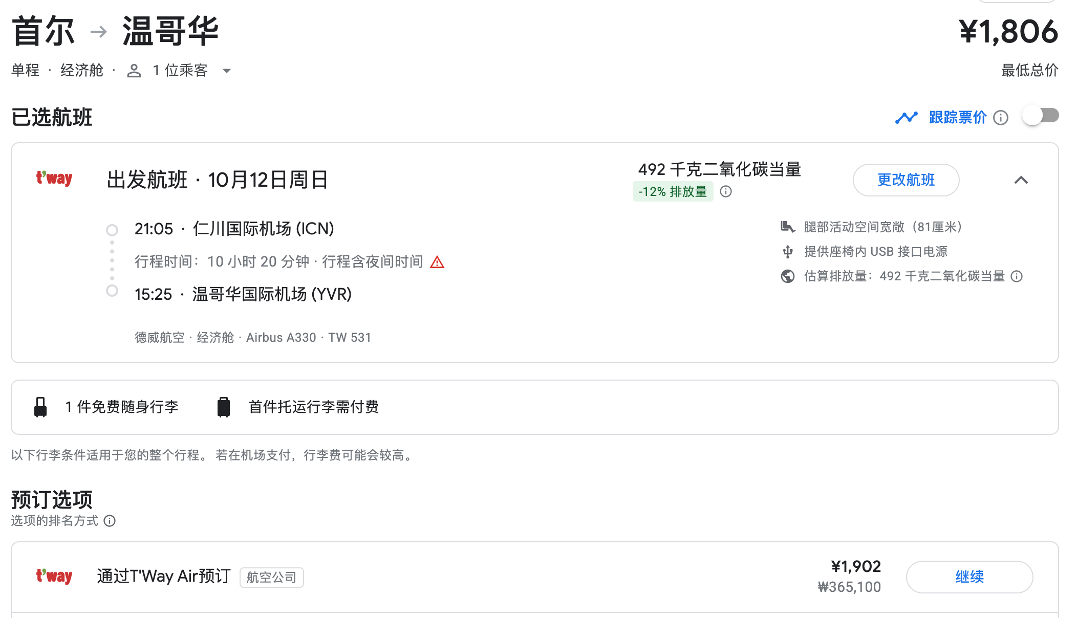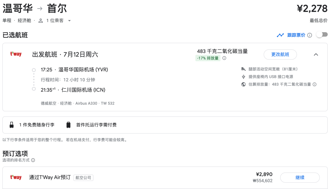 中国-韩国之间的航班,建议留足中转时间,因为大概率行李不能直挂,需要免签入境提取行李,再重新托运。德威航空晚上9点飞温哥华,所以基本全国各地和首尔通航的城市,都是能够衔接上的。