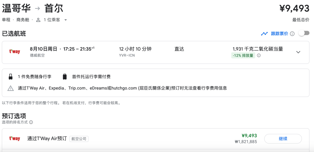 反向温哥华-首尔也是一样9493人民币,几乎所有日期都是这个价