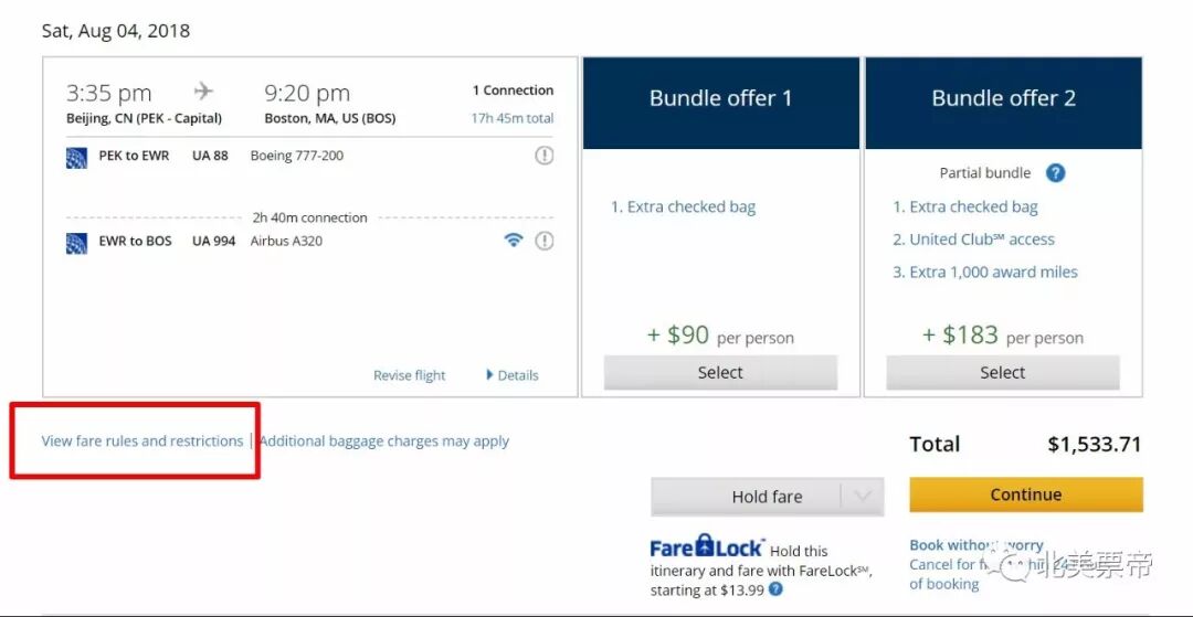 票规Fare rules信息在美联航官网上隐藏的比较深,需要首先完成航班选择步骤到达最终的价格页面: