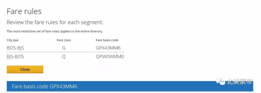 点击查看票规及限制 “View fare rules and restrictions”,在通过验证码/机器人审查之后就可以看见票规了。票帝搜索的波士顿BOS-北京PEK(BJS是票规中北京的代码)由两种不同的仓位G和Q 合并而来,去程G舱,回程Q舱。