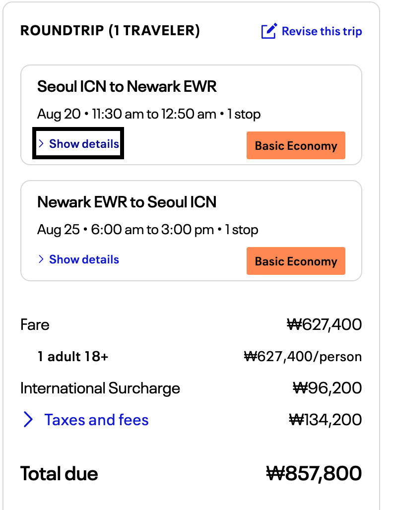 8月20日出发,回程基本任意日期,首尔往返纽约857800韩元(约4435人民币)