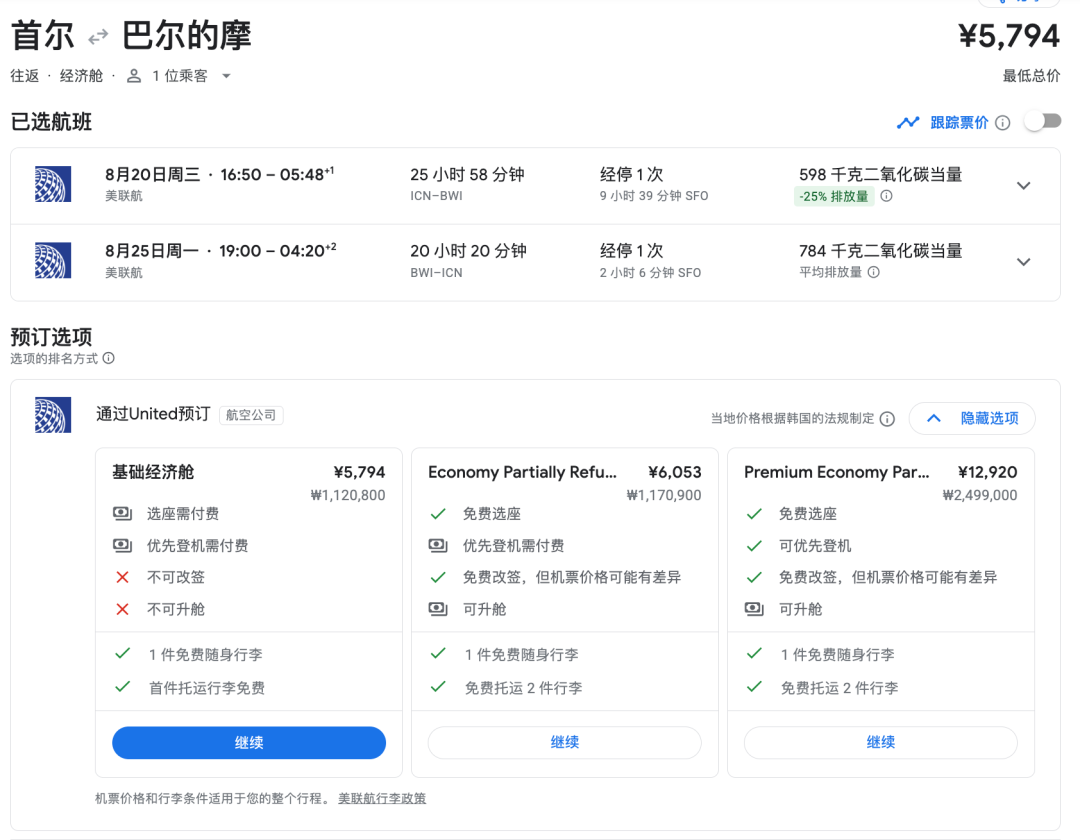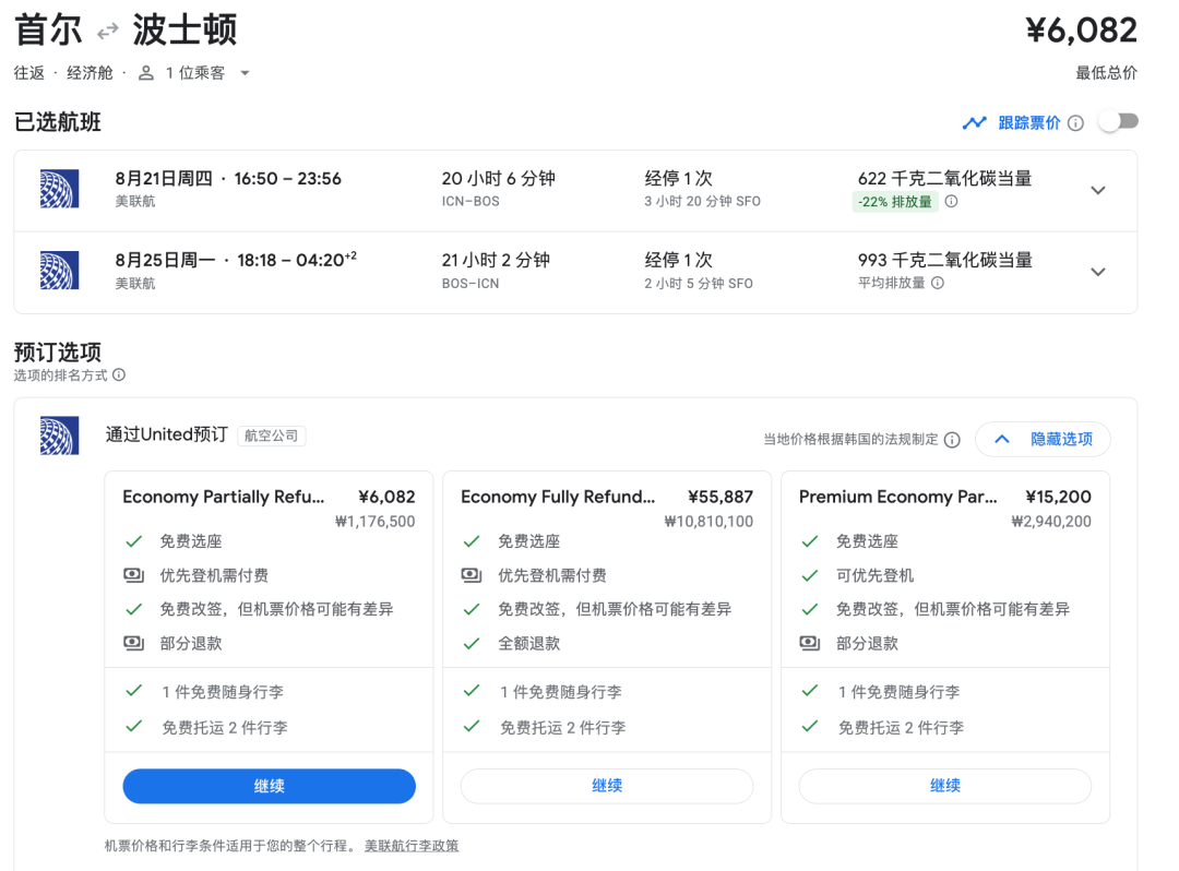 UA- G(基础经济舱/普通经济舱,首尔-美国),