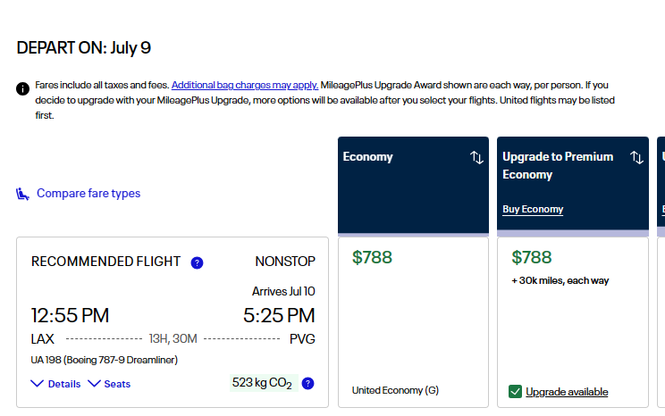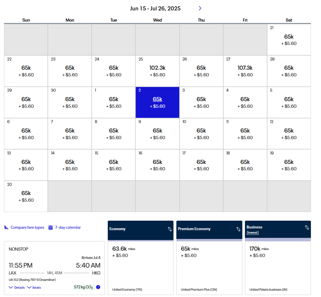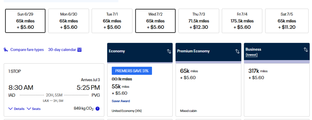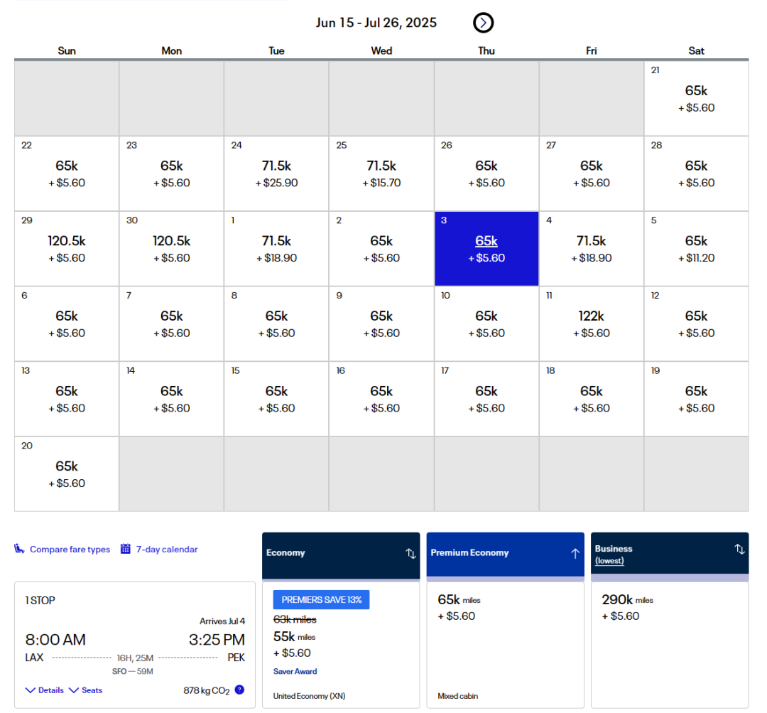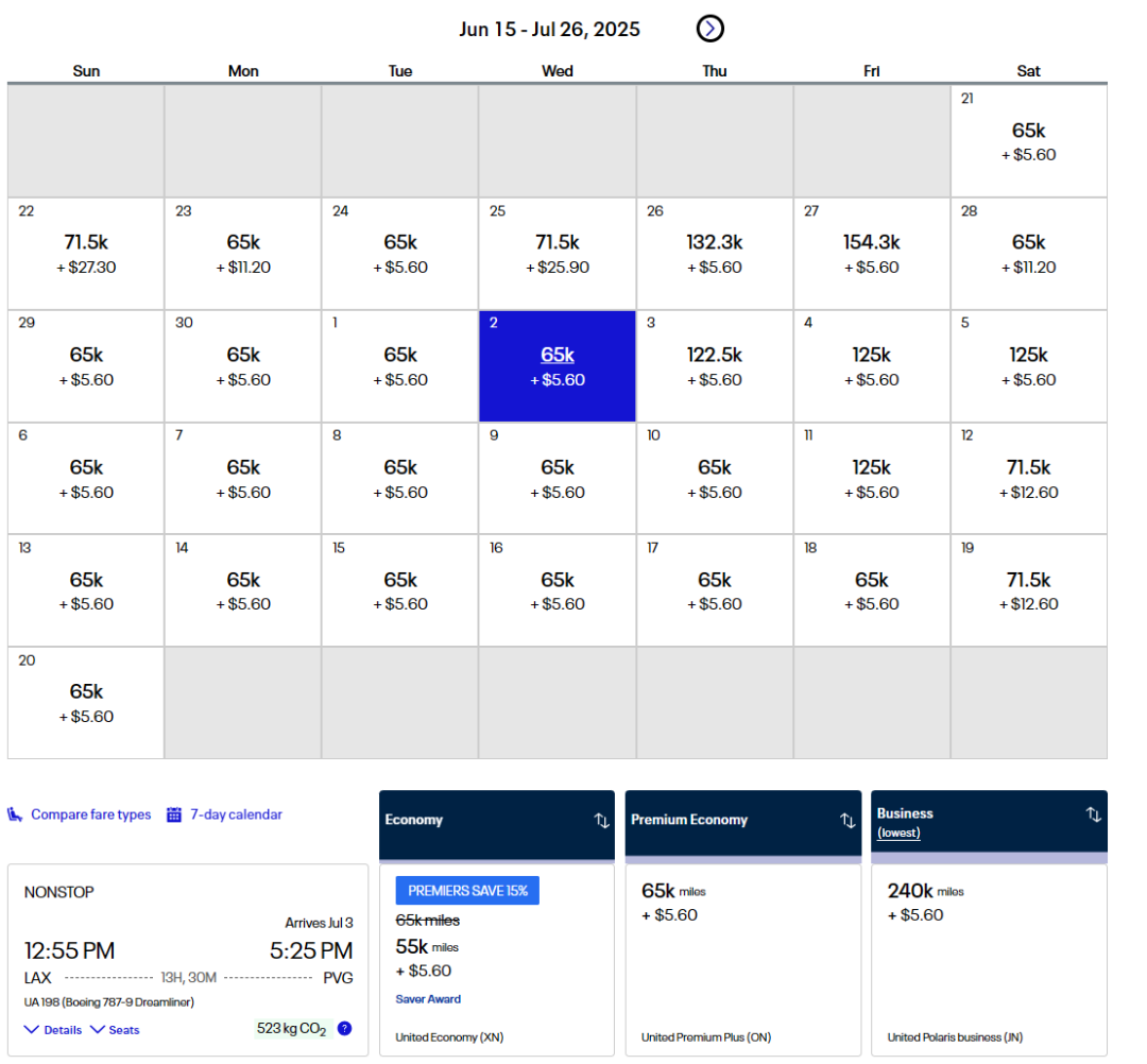 3) 查票用美联航的官网的redeem miles- 日历功能,选择自己的出发城市和国内到达城市。总价不超过上述的里程就行了