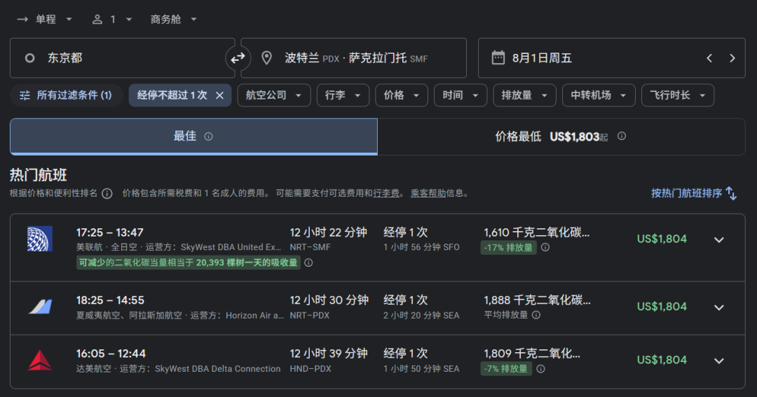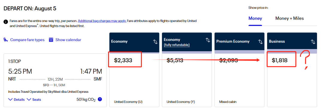 以美联航为例,8月5日 东京成田,经旧金山,飞萨克拉门托经济舱单程2333美金,而平躺商务舱仅需1818美金。其他航司也类似。