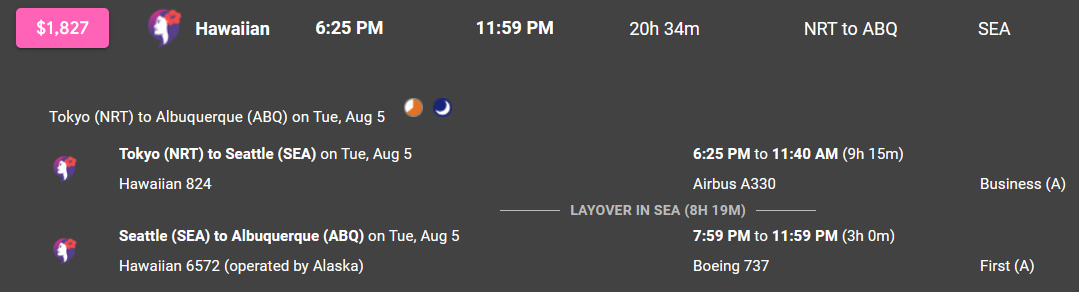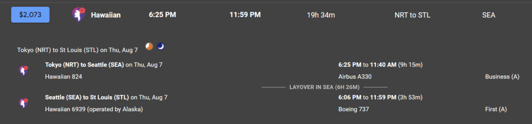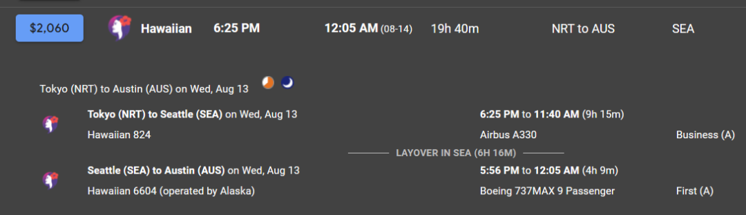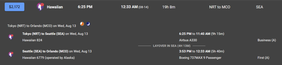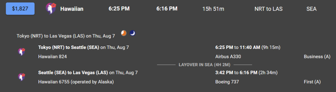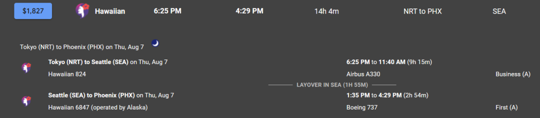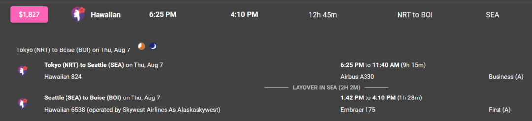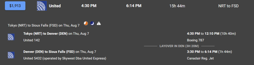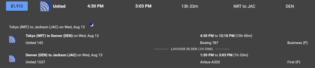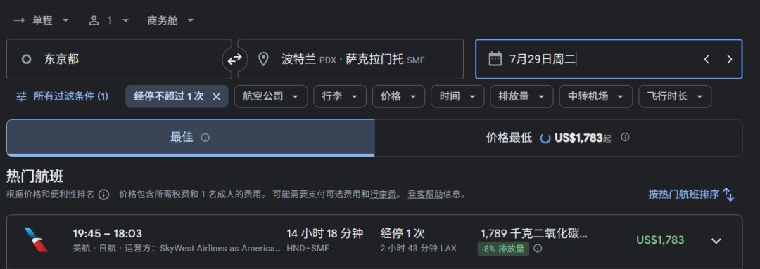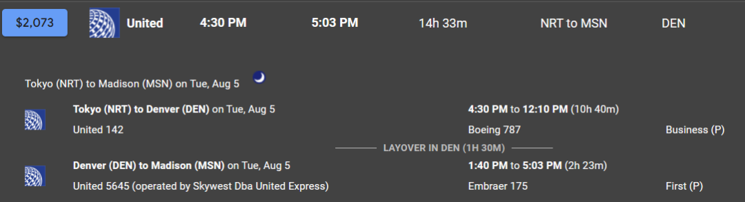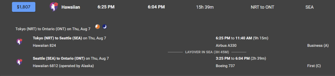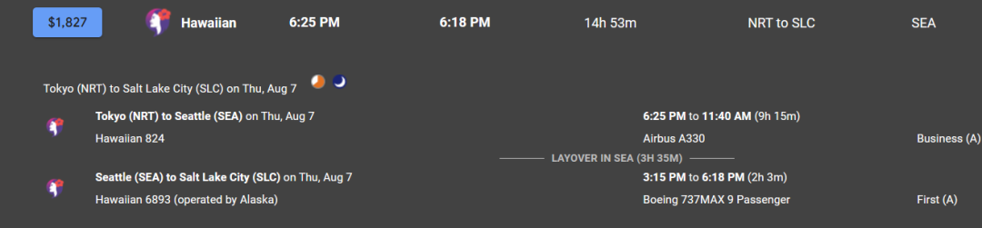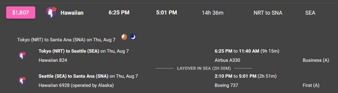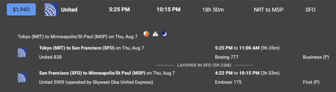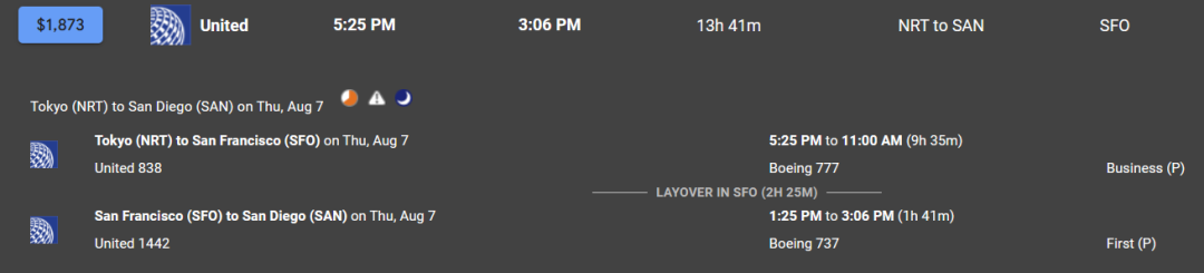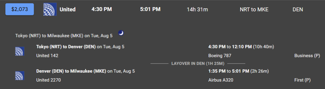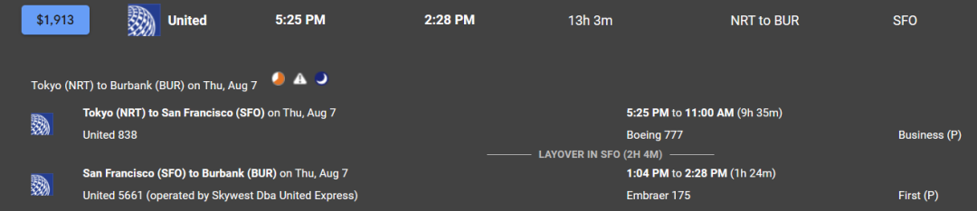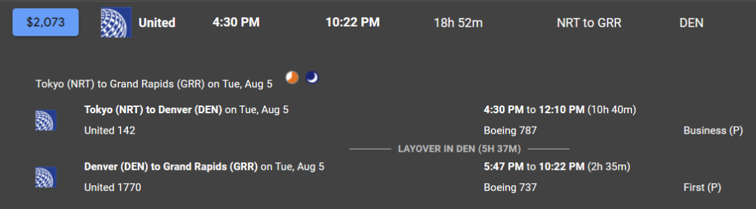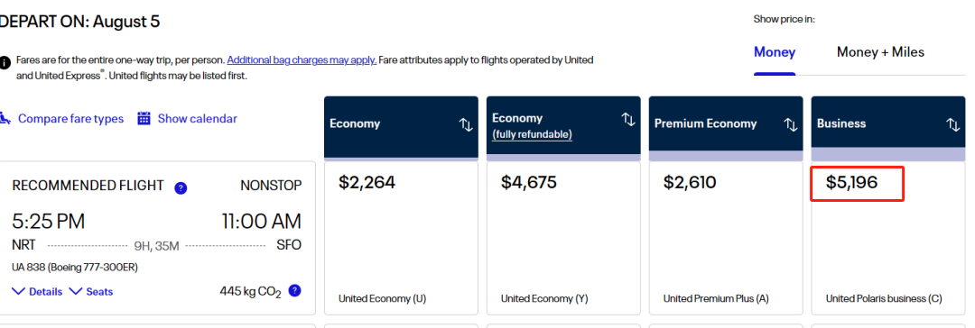 不过很有意思的,此轮促销的美国目的地均是美国的“村里”,而并非门户机场。 比如,同样8月5日从东京成田飞旧金山,商务舱价格飙升至5196美金。