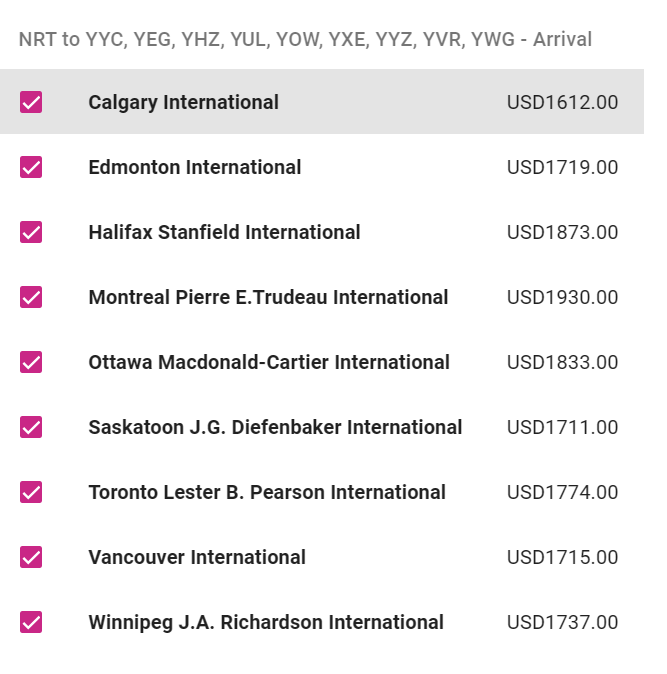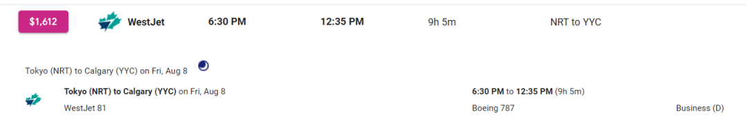WestJet开通了东京-卡尔加里的航线,8月单程的商务舱价格也还行: