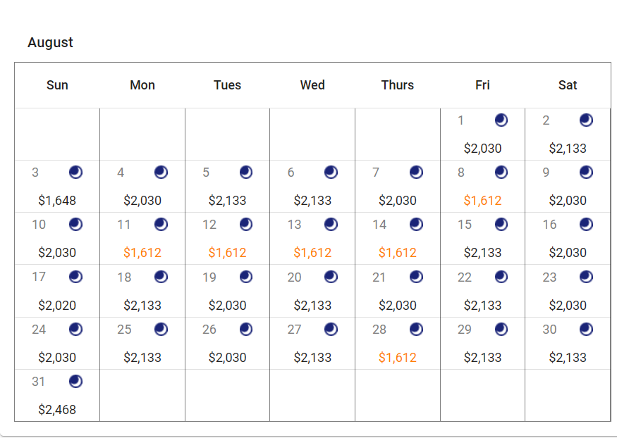 根据票帝的搜索,7月底-8月旺季,含税1800-2100美金左右,不完全的列表如下,总体看8月31日之前有票。