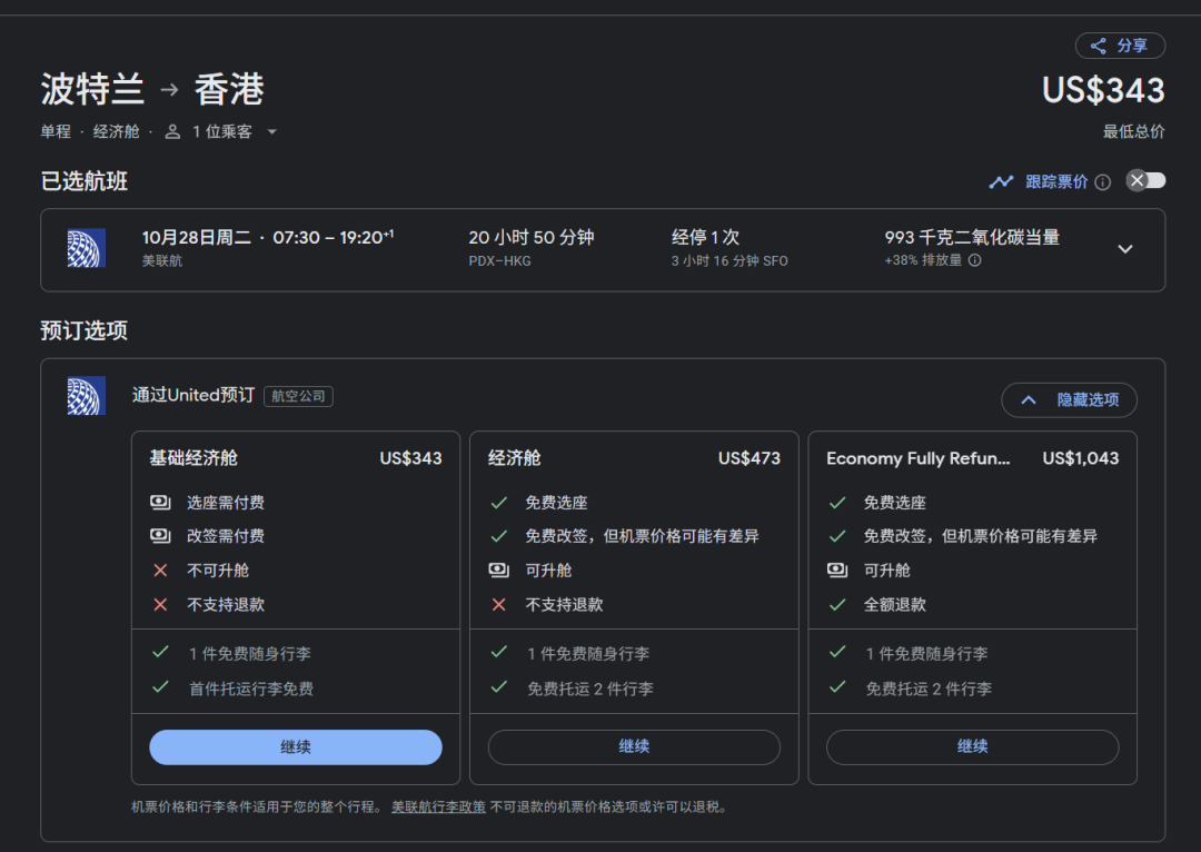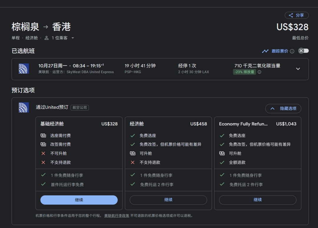 更好的是,可改票可升舱托运2件行李的普通经济舱,也就337美金