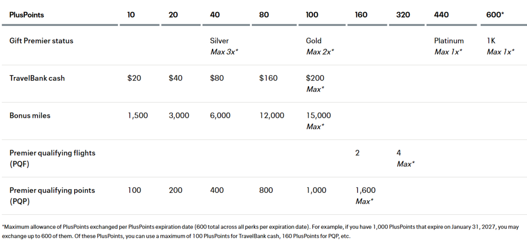 1)2025年及之后获得的PP,允许在过期前一年的3月31日之前,将PP转换成代金券(Travel Bank)、定级航段、定级积分、奖励里程、赠予他人的高卡会籍(含1K)等非升舱产品。每年每位会员最多可转换600 PP,每项兑换也有有数量限制。
