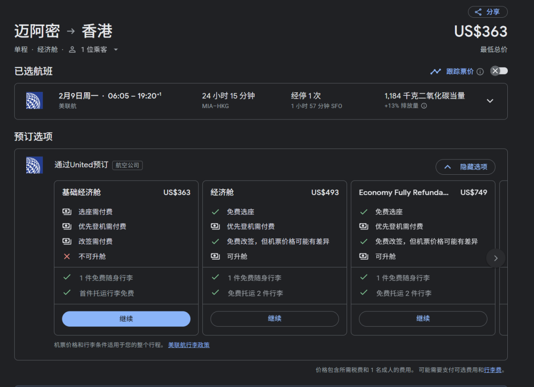 南美桥头堡的迈阿密(AA基地),极度缺乏飞香港的航班,这次也有