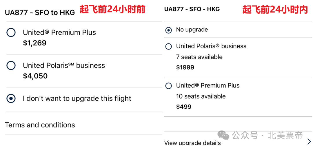 不少航空公司在临近起飞也会将没有卖完的商务舱座位降价销售,以美联航UA为例,在机场/网站/App Check-in过程中,系统会提供升舱Offer。若当时商务舱上座率非常虚靡,升舱offer会特别好……