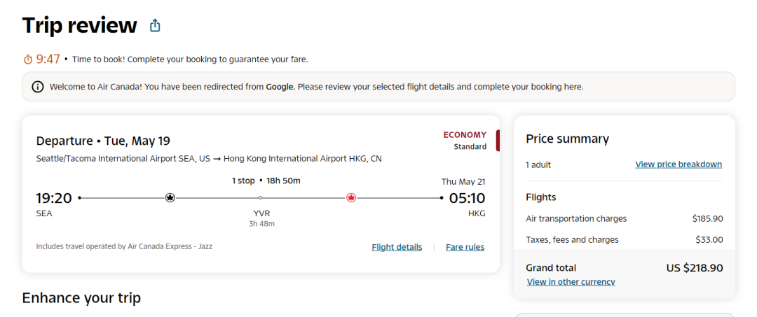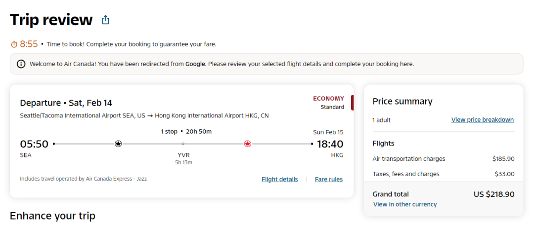 一般来说,单程300多美金回国就是好价格,但这次直接来到了200出头,真的令人有点喜出望外